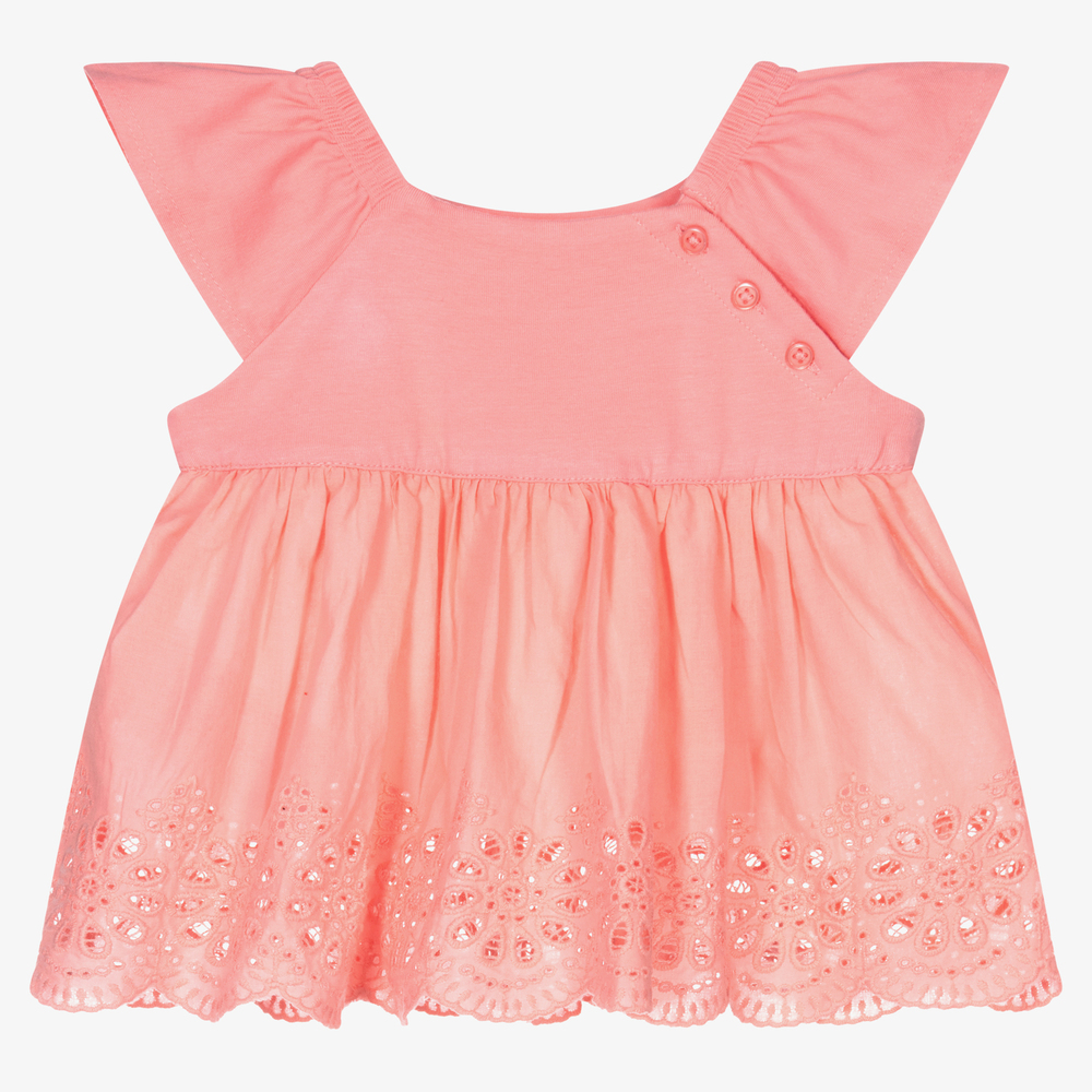 Pretty coral pink cotton T-shirt for little girls by Mayoral. The bodice is made in comfortable jersey, with embroidered scalloped sleeves that are elasticated over the shoulders and have useful button fastenings on one side. The lower part is made in lightweight voile with lovely embroidered cut work around the scalloped hemline.