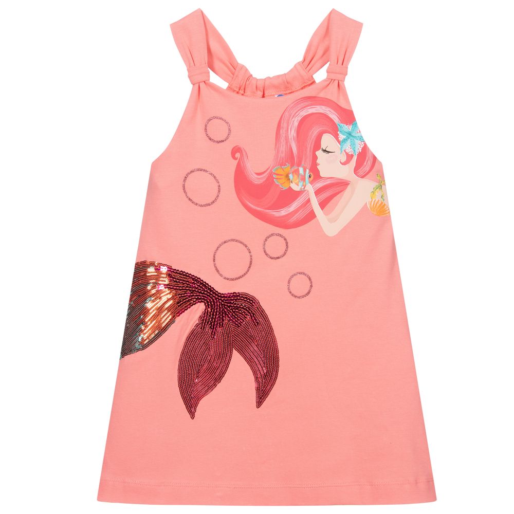 Girls coral pink sundress by Mayoral, made in soft cotton jersey. It has a cute mermaid print, with pink glitter bubbles and a pink and green sequinned tail.