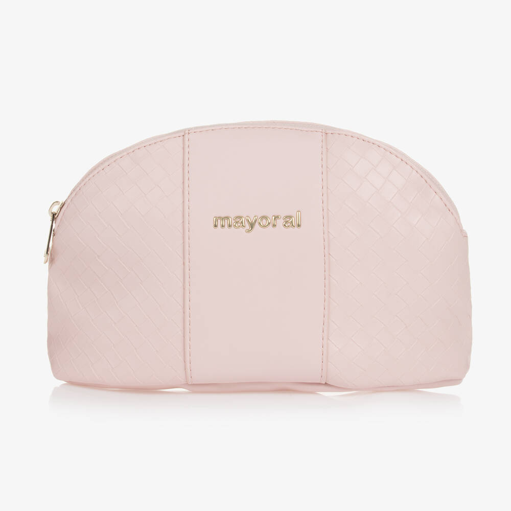 Lovely pale pink pouch for girls from Mayoral, made in smooth faux leather in an embossed weave pattern. Zips-up across the top with a flat base, this practical, multipurpose accessory can be used as a wash bag or to carry your little one's essentials on-the-go. It has a silky, dotty patterned lining and a pale gold logo embossed on the front.