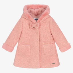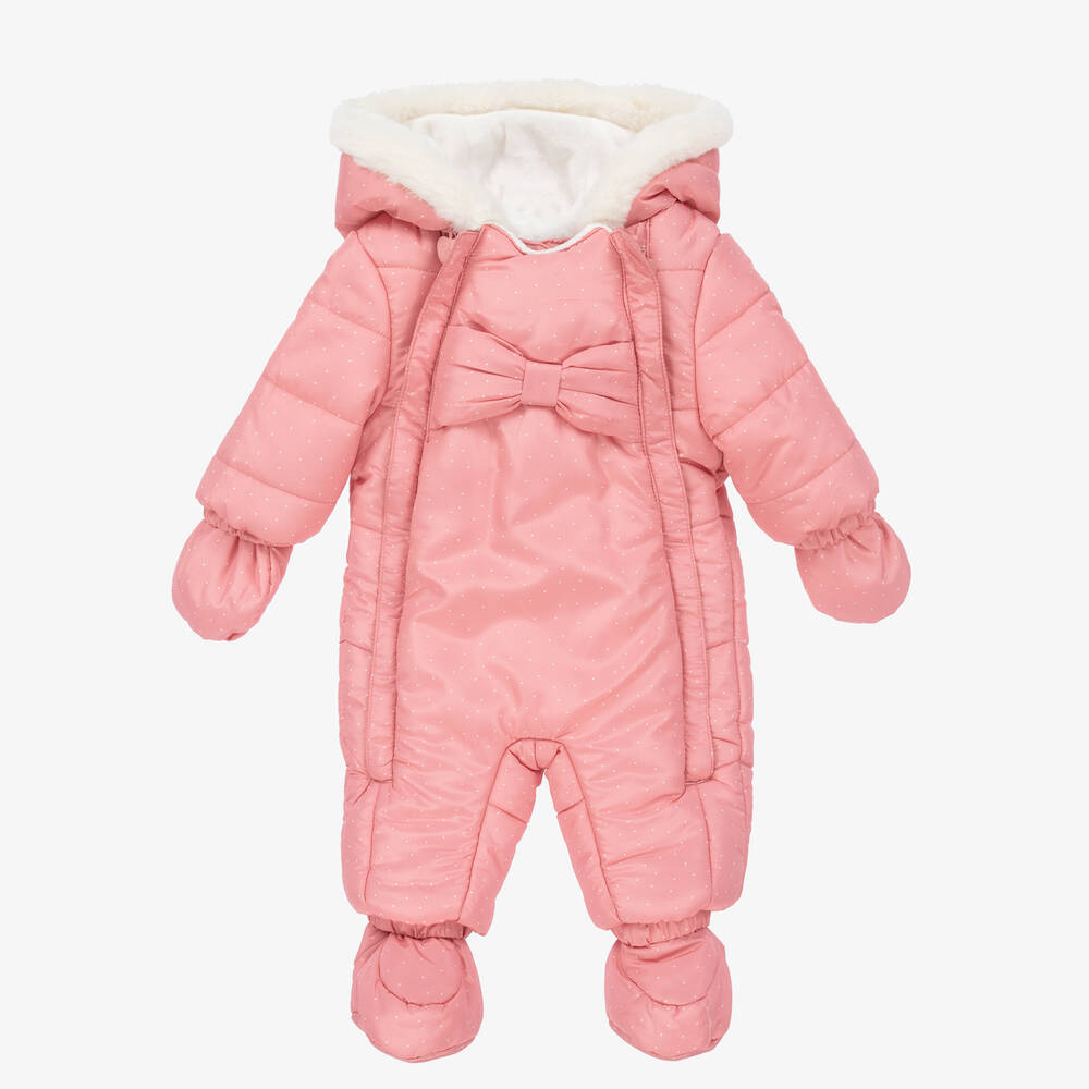 Dark pink padded snowsuit for baby girls by Mayoral Newborn, with a white dot pattern and bow detail on the front. Made from silky polyester, it has a fixed hood with faux fur trim and a soft plush velour lining. There is a double front zip fastening, and it has detachable mittens and booties on the smaller sizes. The fabric contains recycled fibers.