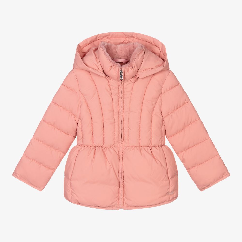 Made in smooth pink, part-recycled polyester, this girls padded peplum coat is by Mayoral. It has vertical stitch detailing throughout and zip fastening detachable hood. It is half-lined in lovely soft plush polyester faux fur.