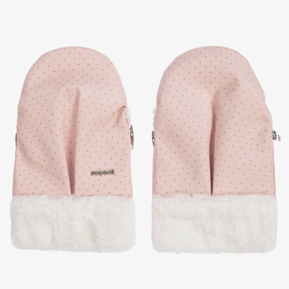 Pink stroller mittens by Mayoral Newborn, ideal for keeping adults' hands warm whilst baby is in the pram. They are made in pink vinyl with grey polka dots and have a super soft, ivory faux fur trim and lining. They have openings at the sides with zip fastening and easily attach to most brands of strollers and prams, with holes on either side of the mittens to thread through the handles.