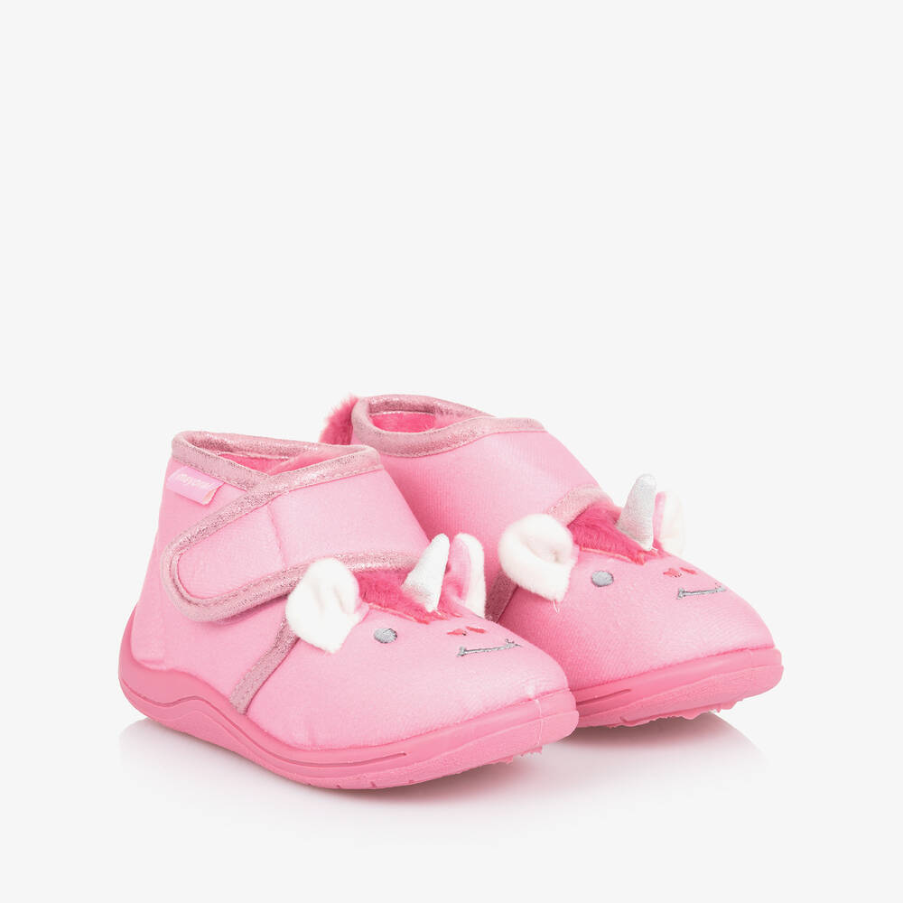 Cute pink slippers for baby girls by Mayoral, made in soft velour. They have a fun unicorn design on the front with 3D ears and horn, a faux fur mane on the tongue and faux fur tail on the back. Lined in cosy velour, to keep little feet warm, they have a velcro fastening strap across the foot and non-slip rubber soles.