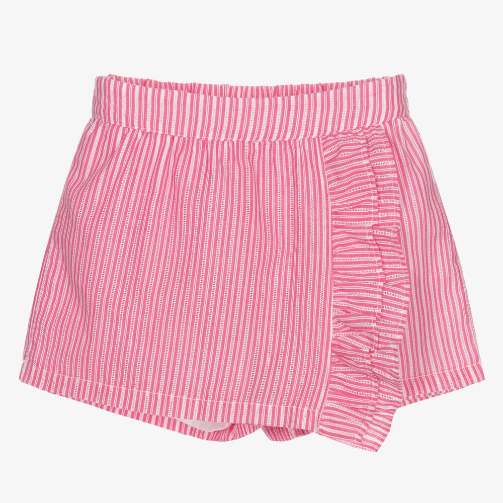 Pink and white stripe skort for girls by Mayoral. made and lined in lightweight polycotton. There is pretty cutwork detailing within the stripes, a frilled trim on the front overlay, and an elasticated waist around the back. The waistband is adjustable for a comfortable fit.