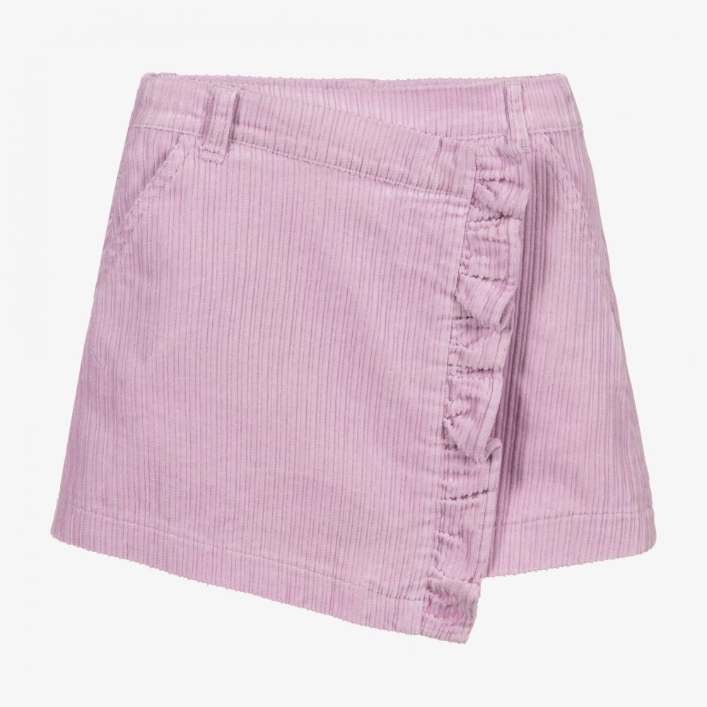 Lilac purple skirt for girls by Mayoral, made in soft cotton corduroy, with a ruffle trim. In a wrap-over style, it has front and back pockets, a side zip and useful adjustable waist.