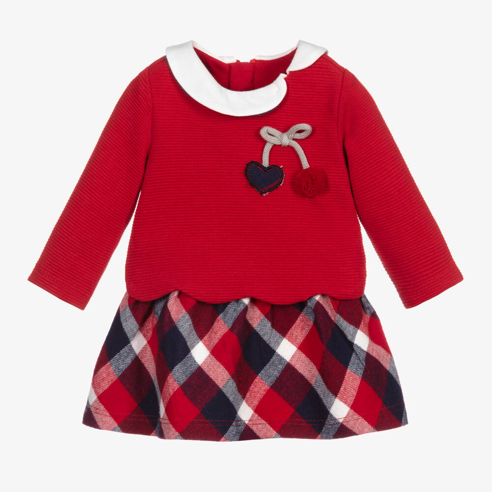 Red dress for baby girls by Mayoral Newborn. Made with soft and stretchy ribbed cotton jersey, the bodice has a smart asymmetric collar and a fun cherry motif, decorated with a red tulle pom-pom, a grey bow and a blue heart appliqué. Soft and cosy, the check skirt is made with mid-weight cotton.