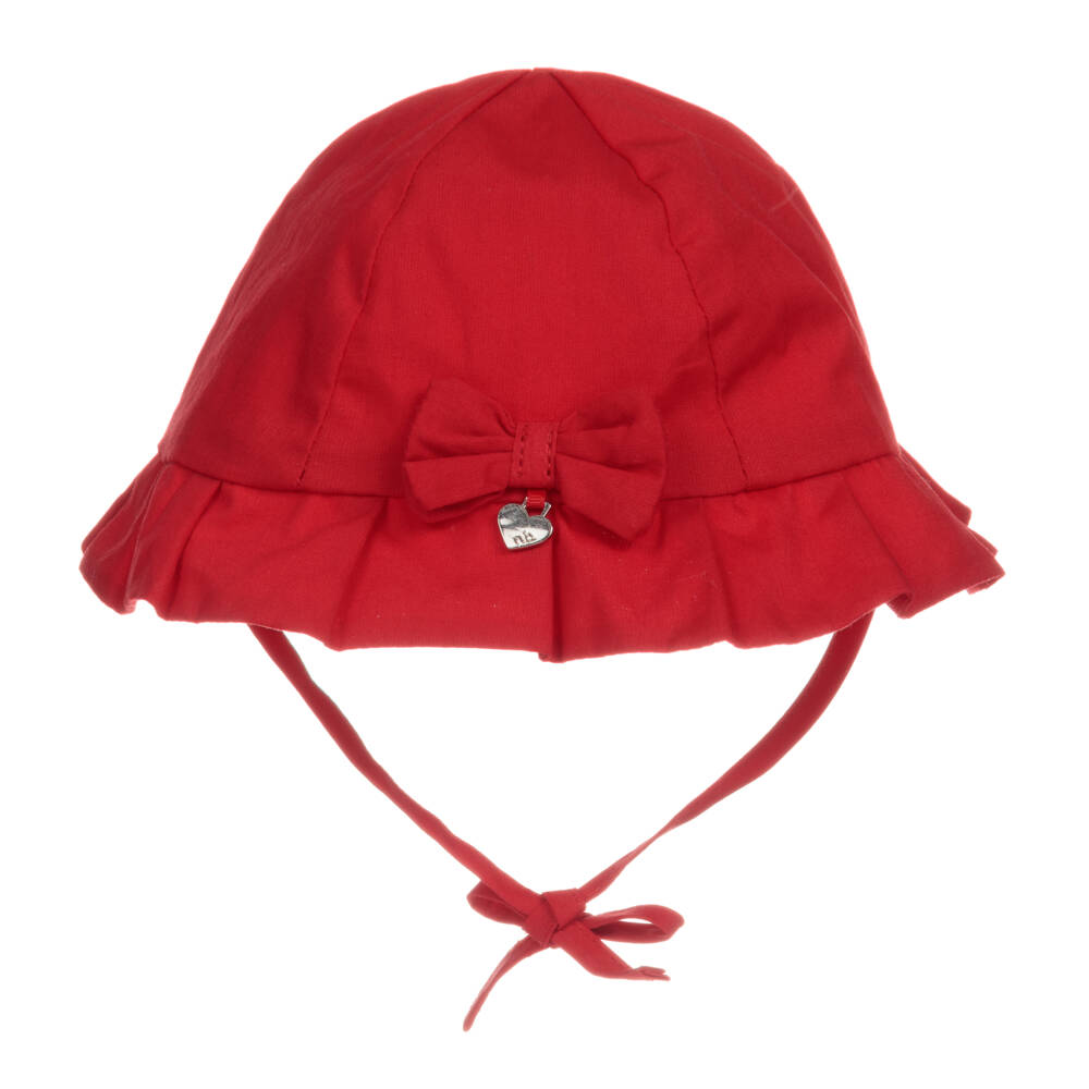Red hat for baby girls by Mayoral. Made in soft cotton, it has a pleated brim with a pretty bow detail. It secures with ties under the chin.