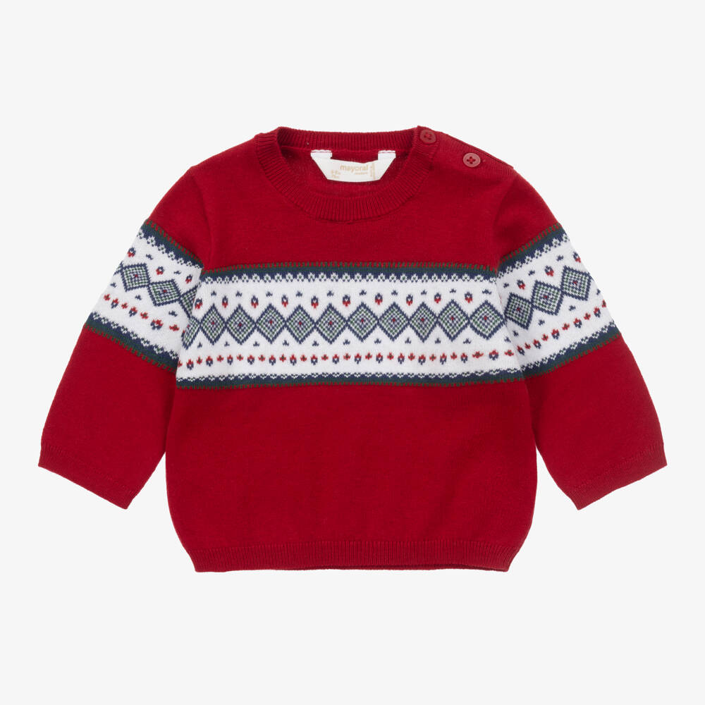Red sweater for baby boys and girls by Spanish brand Mayoral, with a lovely Fair Isle pattern. Soft and comfortable, it is knitted in a warm cotton and wool blend with cosy, ribbed trims. There are button fastenings on one shoulder to make dressing easier.