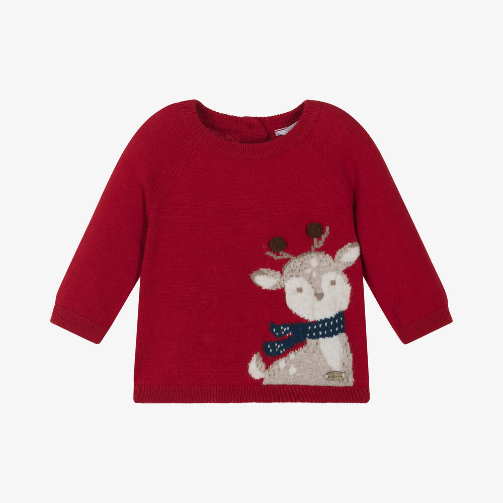 A lovely red sweater for baby boys and girls by Mayoral, with a festive reindeer intarsia on the front. Warm and comfortable, it is finely knitted in a soft cotton and wool blend, with cosy ribbed trims on the raglan style, long sleeves. It fastens with wooden buttons on the back.
