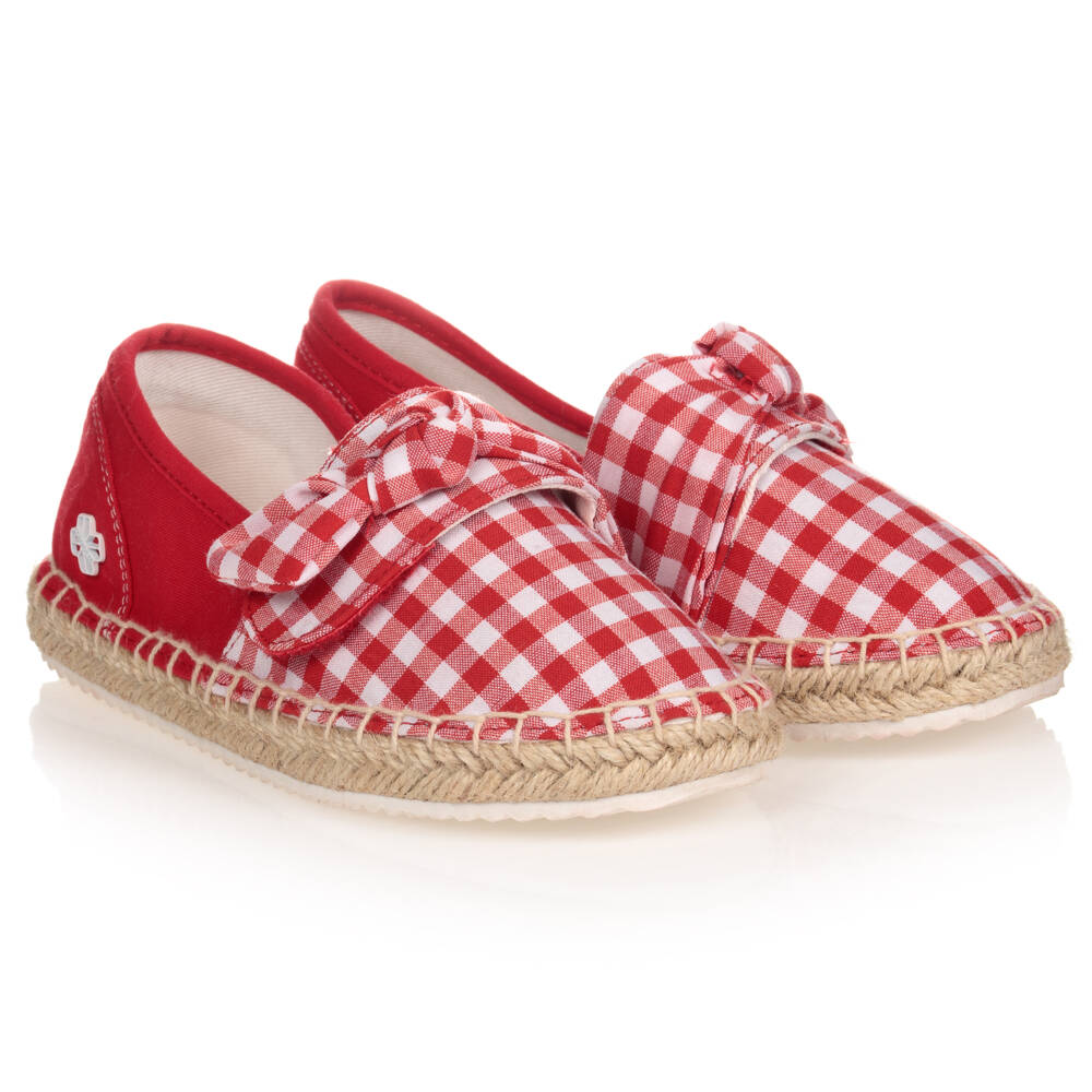 Red gingham check canvas espadrilles for girls by Mayoral. With a traditional rope outer sole, they have a velcro foot strap decorated with a pretty bow, as well as a white metal logo tab on the heel and a non-slip rubber sole.