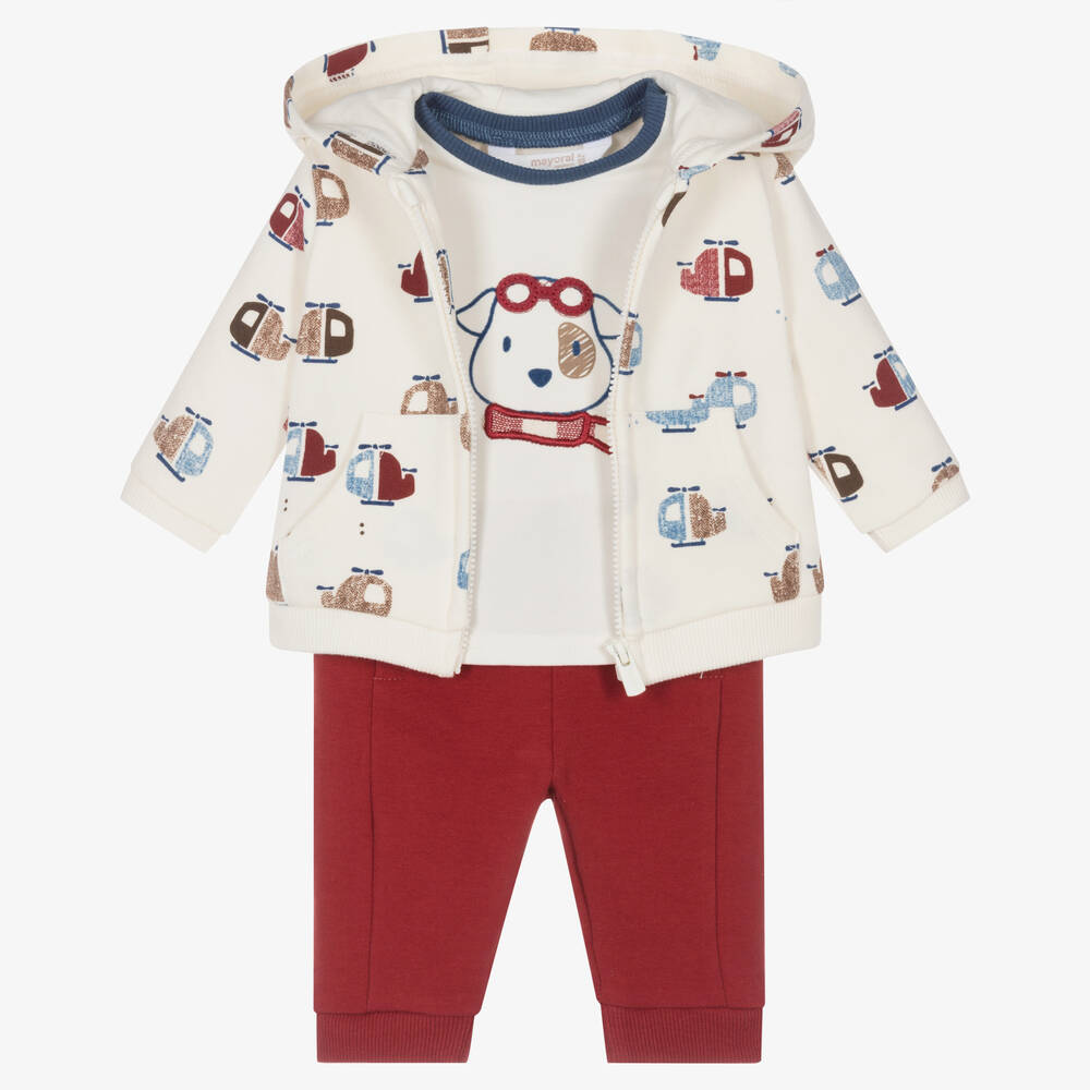 Sweet ivory and red cotton tracksuit set for baby boys and girls by Spanish brand Mayoral. Made in comfortable jersey with a fleecy inside for cosiness, the zip-up hoodie has a red and blue helicopter print, hand pockets on the front and warm, ribbed trims. The joggers are easy to wear, simply pulling up. They have a faux drawstring and faux front pockets. The tracksuit comes with a top that has a cute puppy appliqué on the front, a ribbed blue neckline and a useful popper fastening on one shoulder to make dressing easy.