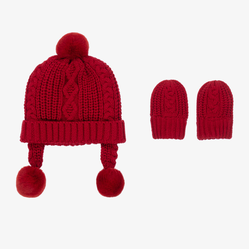 A red hat and mittens set for baby boys and girls by Mayoral, knitted in a super soft cotton blend. Warm and snuggly for colder days, this set has a cute cable knit pattern and comfortable ribbed trims. The beanie has faux fur pom-poms on the top and on the ear flaps.