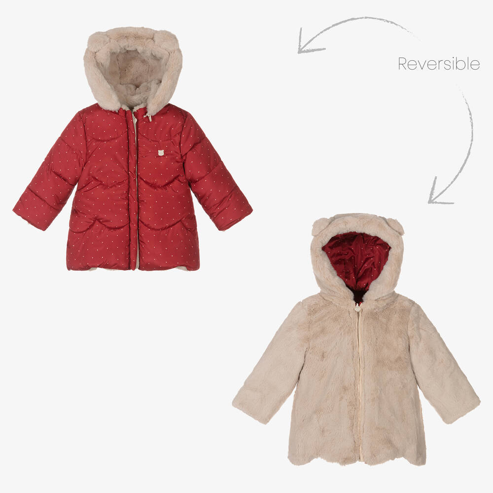 Adorable red and beige reversible coat for baby girls by Mayoral Newborn, made in soft polyester with a detachable hood. The smooth red side has a delicate ivory heart print and a teddy bear logo badge. It has a scalloped hem, faux fur hood trim and concealed side pockets. The reverse side is made in super soft faux fur and has cute little ears on the hood.