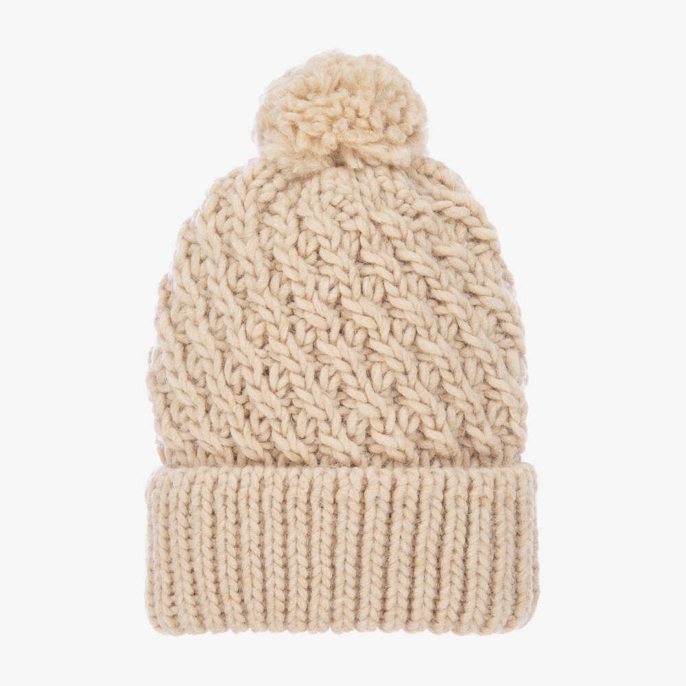 Chunky knit beige winter hat for teen girls by Mayoral. Made in a lovely soft blend of acrylic, wool and alpaca, it has a ribbed brim and a wool pom-pom on the top.