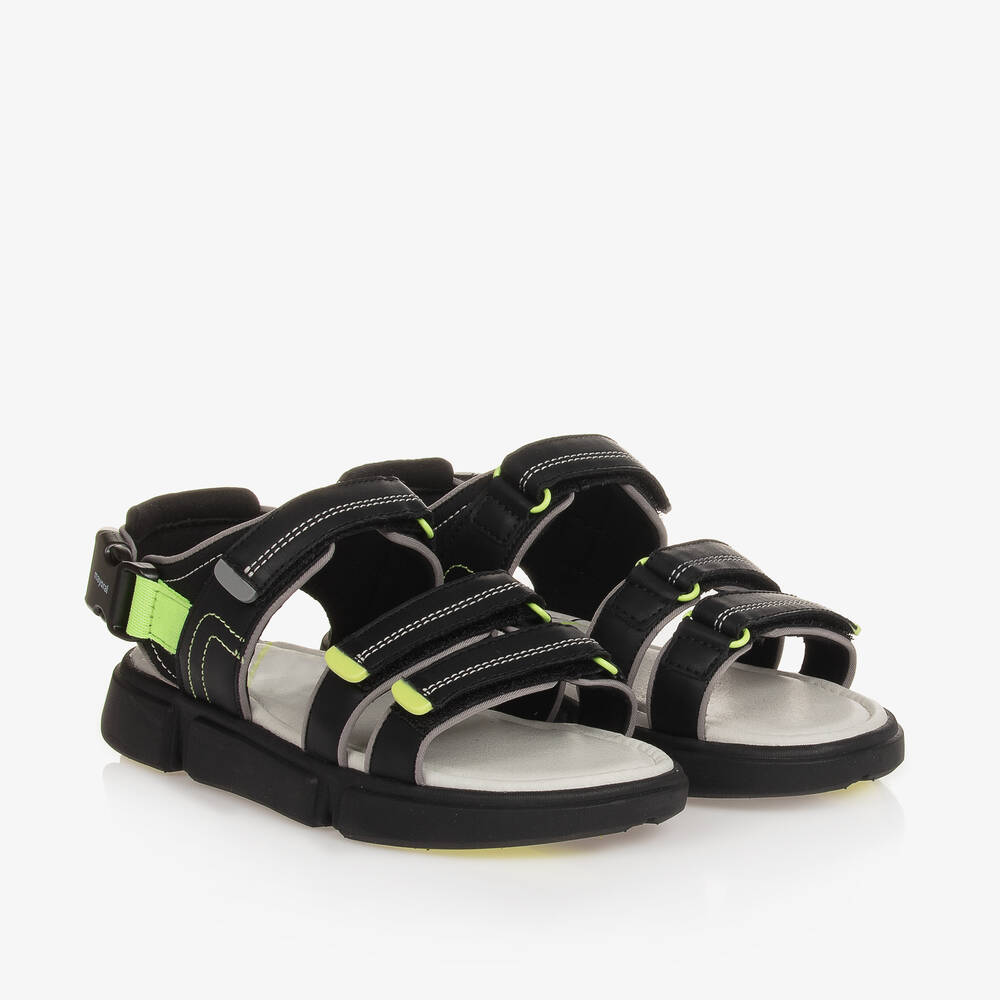 Black sandals for teen boys by Mayoral, with contrast stitch detailing and bright neon green trims. Made in smooth faux leather, they have a soft textile lining and padded insole for comfort, with a chunky rubberised outer sole for improved grip. For an adjustable fit, there are three velcro fastening straps across the foot and adding that signature touch, the buckle-clip on the ankle strap is detailed with the designer's name.