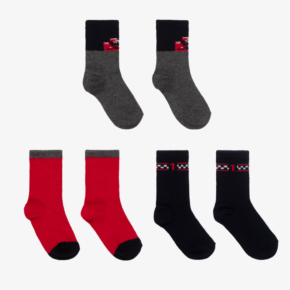 Three-pack of sporty ankle-length socks for teen boys by Mayoral, in red, navy blue and dark grey. Cool for everyday wear, these cotton socks have racing car-inspired designs. This item contains organic cotton.