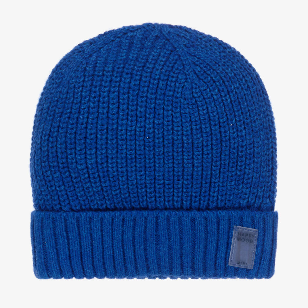 Cosy and comfy bright blue beanie hat for teen boys by Mayoral, in a soft chunky knit. The ribbed turned up brim has a rubberised logo patch, printed with a 'Happy Mood' slogan for a positive vibe.