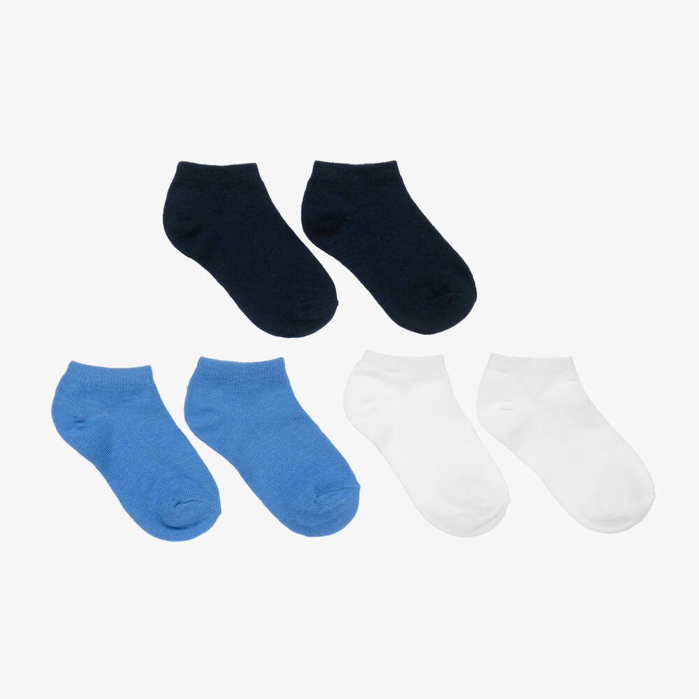Soft and stretchy socks for teen boys from Mayoral, with elasticated cuffs for comfort. This three-pack of trainer socks in white, sky and navy blue are made in a soft cotton blend.