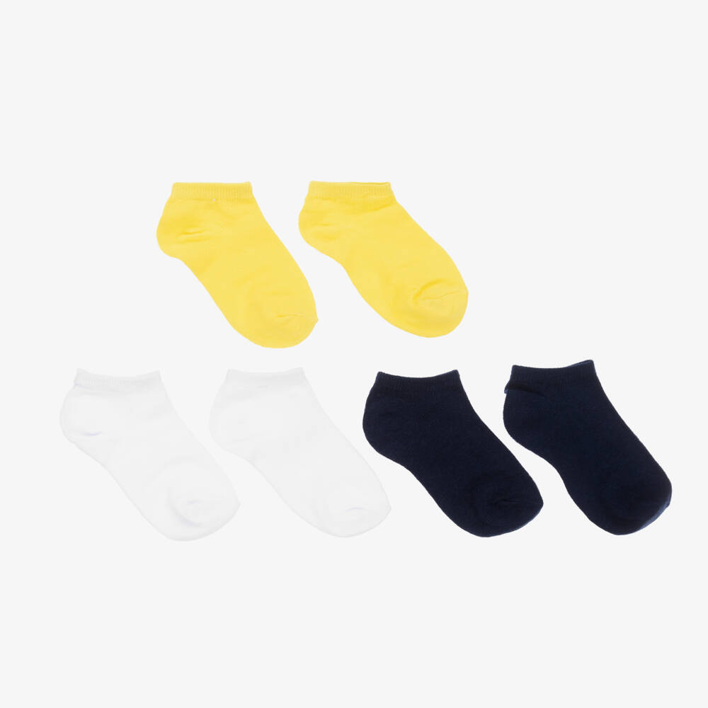 Soft and stretchy socks for teen boys from Mayoral, with elasticated cuffs for comfort. This three-pack of trainer socks in white, yellow and navy blue are made in a soft cotton blend.