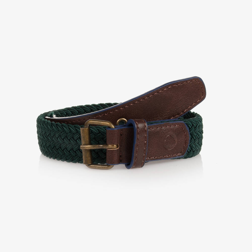 Stylish forest green braided belt for teen boys by Mayoral. Ideal for adding a stylish touch to any outfit, this classic belt has brown faux leather trims and a bronze metal buckle fastening for an adjustable, comfortable fit. It is made in a soft and stretchy weave.