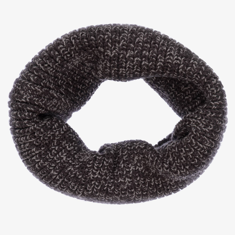 Keep warm with this grey snood for teen boys by Mayoral. It is detailed with a white rubberised logo badge on the front for a subtle branding touch. Knitted in soft acrylic, there is a cosy fleece lining for warm wear on cooler days.