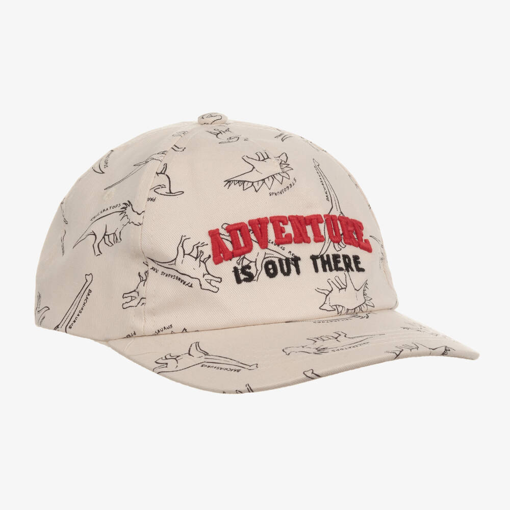 Ivory cap for teen boys from Mayoral, with a black dinosaur pattern. Made in sustainable cotton twill for comfortable wear, it is embroidered on the front with 'Adventure is out there' in red and black. For an easy, adjustable fit, it has a velcro strap on the back, together with a red logo tab.