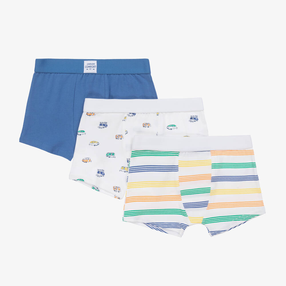 White and blue boxer shorts for teen boys by Mayoral, designed with assorted patterns. In a handy pack of three, these cotton blend boxers feature striped designs and a colourful campervan print. They have elasticated tape waistbands for maximum comfort.