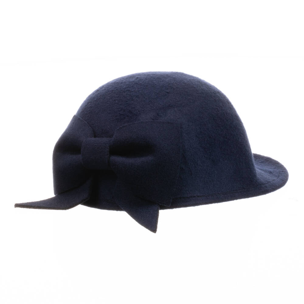 Navy blue hat for teen girls by Mayoral, made in polyester felt with a wool-like feel. It has a peak on the front and large bow on the back.