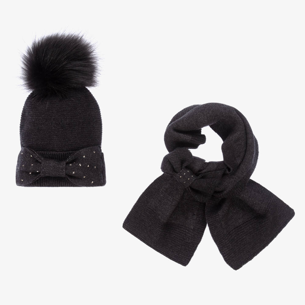 Dark grey hat set for teen girls from Mayoral, made in a soft viscose blend for softness and warmth. The beanie hat has a ribbed brim and a large faux fur pom-pom on top. Both the hat and the scarf have decorative bows with diamanté trims for a sparkly effect.