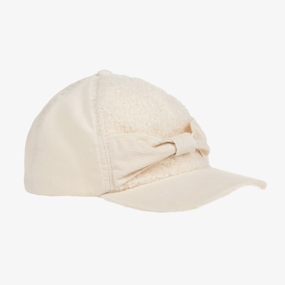 Ivory cotton cap for teen girls by Mayoral, made in soft cotton needlecord. There is a faux shearling front panel with a decorative bow across the front. The peak has super soft faux shearing underneath and the lining is made in breathable cotton poplin for comfort.There is an elasticated strap at the back.