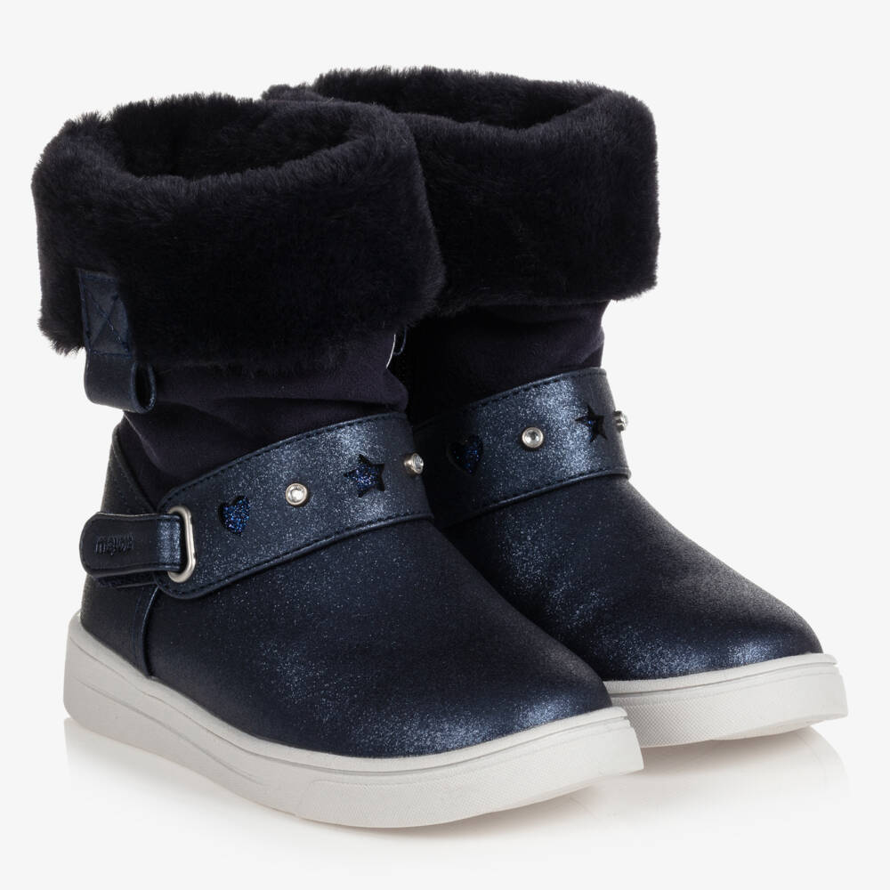 From Mayoral, navy blue convertible boots for teen girls which can be worn as a long boot or turned down with faux fur trim. They are made in soft faux leather for comfort with a non-slip rubber sole for improved grip and have pull tabs to assist with dressing. They have a side zip fastening with a glitter and diamanté decorated velcro strap for a secure fit.