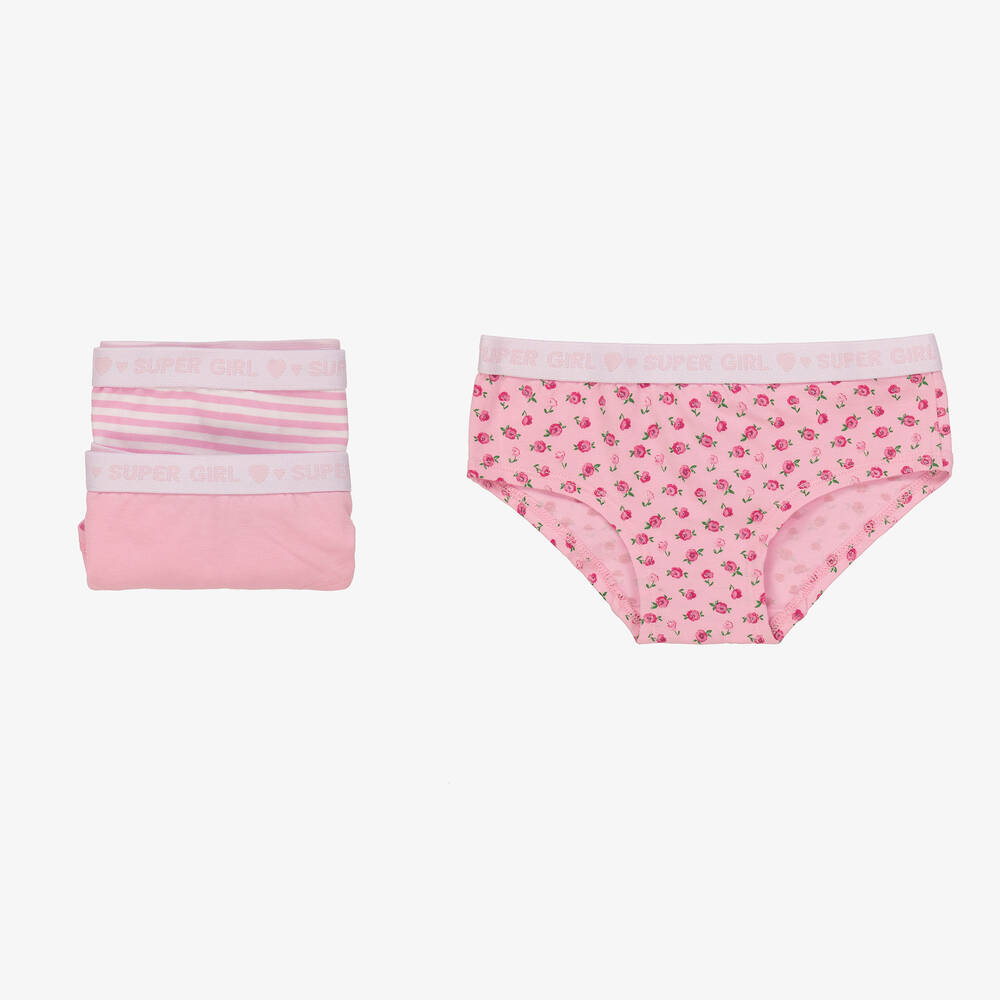 Pack of three pink knickers for teen girls by Mayoral. One pair is plain, the other pair is striped, and the third pair has a pretty floral pattern. Made in soft and stretchy cotton jersey, all have gently elasticated 'supergirl' waistbands for a comfortable fit