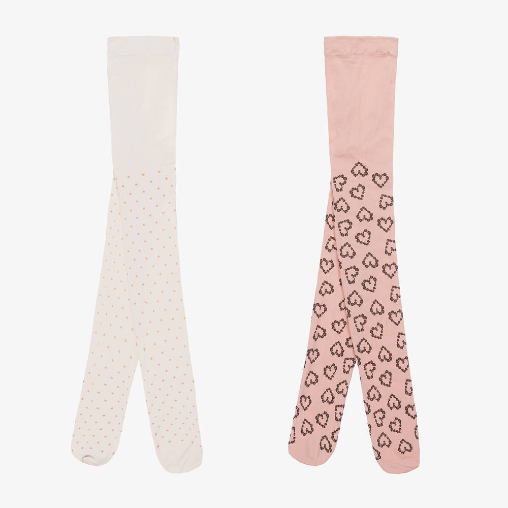 Lovely for accessorising, a two-pack of tights for teen girls from Mayoral in pink and ivory. One pair has a leopard print love heart pattern and the other pair has a rose gold polka dot design in glitter.