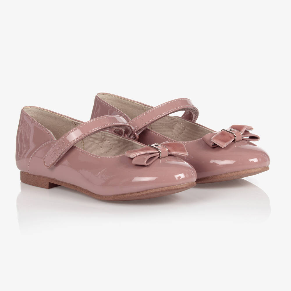 Smart dusky pink patent shoes for teen girls by Mayoral, made for special occasions. They have gorgeous pink velvet bow on the toes with glamorous silver accents, and are lined with comfortable padded leather insoles. Fastening with velcro, the useful strap across the foot is embossed with the brand's logo, and they have a non-slip rubber sole for good grip. The lining contains eco-conscious recycled cotton.