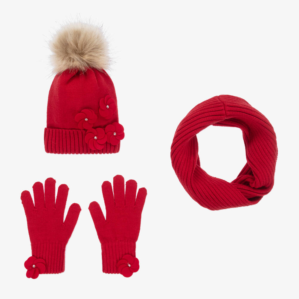 Red hat set for teen girls by Spanish brand Mayoral. The hat has a large faux fur pom-pom on the top and pretty felt flowers on the front. The diamantés in the centre add extra sparkle. The coordinating gloves have ribbed cuffs and the warm snood has a twisted design on the front. All items are knitted in a soft and stretchy viscose blend, designed for layering up in the cold weather.