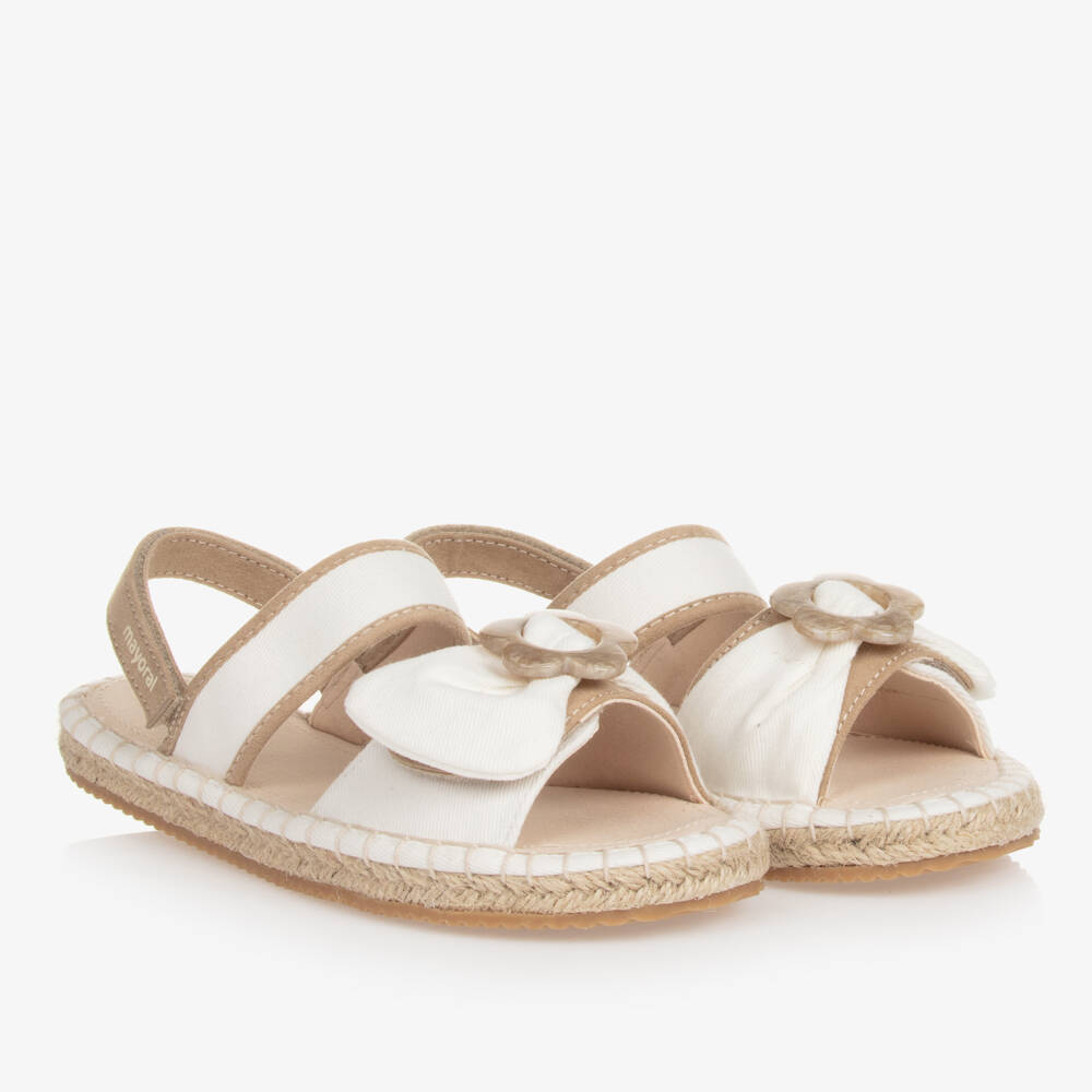 White canvas sandals for teen girls by Mayoral, with espadrille-style braided jute midsoles for a stylish contemporary look. Designed with beige trims, they have a padded canvas insole for comfort and a ridged rubber outer sole for improved grip. The velcro fastening toe strap is decorated with a bow and flower charm, whilst the velcro strap around the back of the heel is stamped with the designer's name for a signature finish.