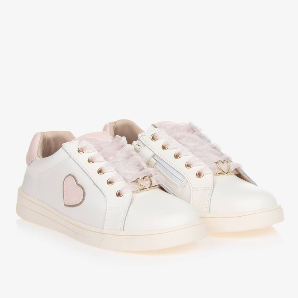 Stylish white leather trainers for teen girls by Spanish brand Mayoral, with pink trims and subtle embossed logos. They are detailed with a pretty pink and gold heart appliqué on one side and a shiny gold heart charm on the sheer pink faux laces. Lined in soft textile for comfort, they have a removable padded insole, with both antibacterial and odour-inhibiting properties. The non-slip rubber outer sole provides good grip and they fasten easily with a zip and velcro tab on the side.