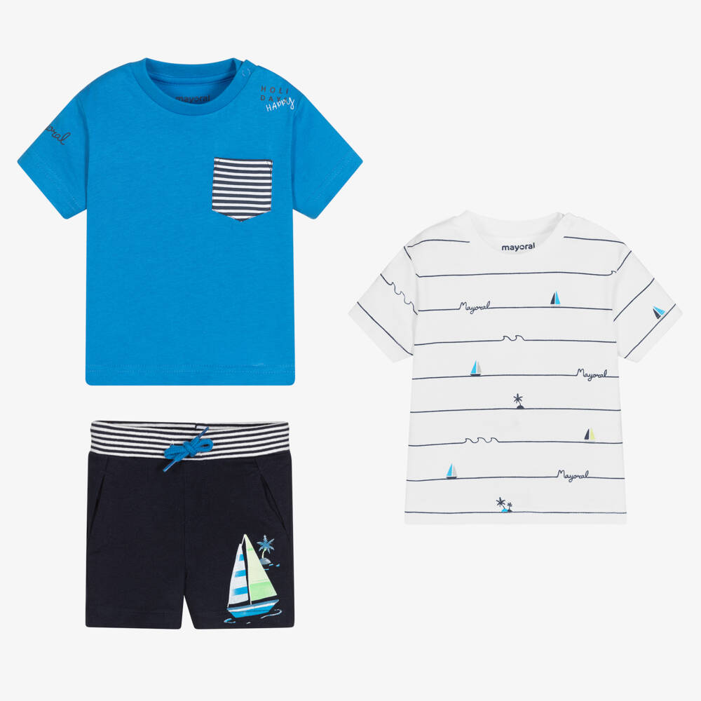 Three piece shorts set for little boys by Mayoral, made in soft cotton jersey. The bright blue T-shirt has a navy blue and white striped patch pocket, while the white T-shirt has fine navy blue stripes with a sailboat and palm tree print. The shorts have a ribbed drawstring waist, with a matching sailboat print on one side.