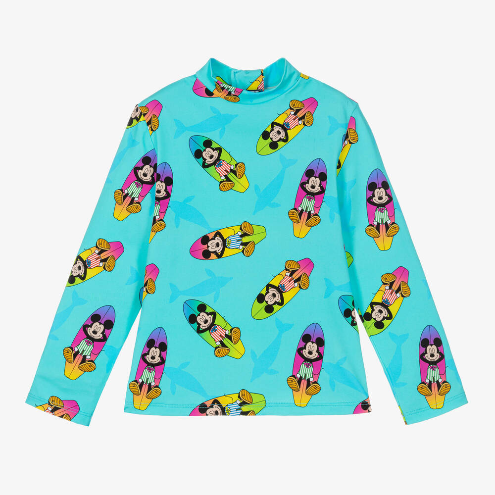Turquoise blue swim top for boys by MC2 Saint Barth, made from a silky, stretchy fabric with UPF50+. Designed with long sleeves, it is patterned with Disney's Mickey Mouse relaxing on a brightly coloured surfboard. Fun to wear around the pool or at the beach, it fastens with a zip on the front.