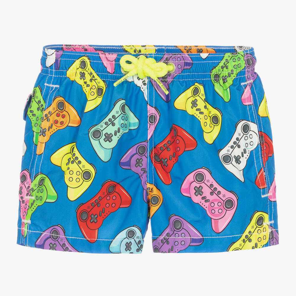 Blue swim shorts for boys from Italian swimwear designer MC2 Saint Barth, made with recycled materials. Soft and lightweight, these shorts are designed with a fun, colourful gaming controller print. They have an adjustable drawstring waistband and a breathable mesh lining for comfort. A logo badge, side seam pockets, and a velcro back pocket complete the look.