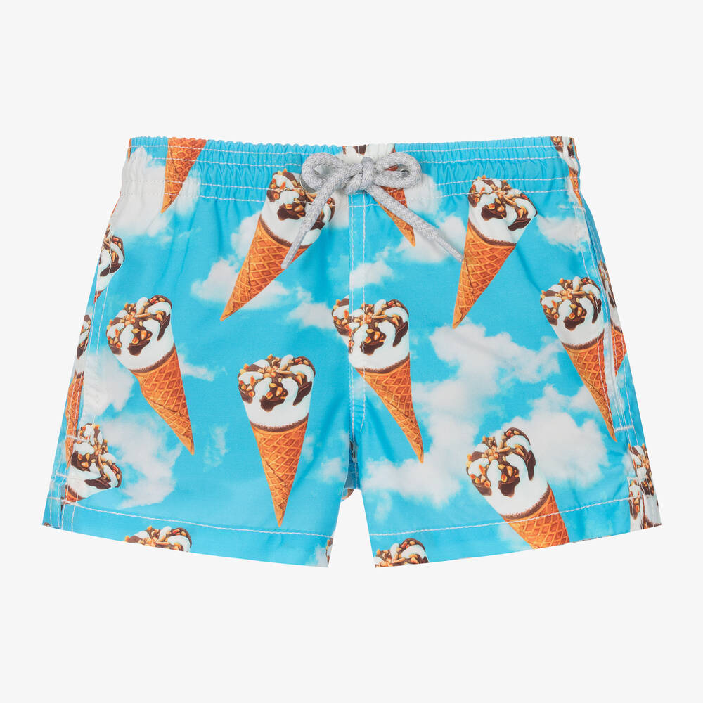 Light blue swim shorts for boys by MC2 Saint Barth, made with soft recycled fabric and lined with dark navy blue mesh. These lightweight shorts have a cloud background, patterned with delicious ice creams. The waistband is elasticated for comfort and the grey drawstring ties can be tightened for an ideal fit. There are useful side seam pockets and an additional velcro pocket on the back.