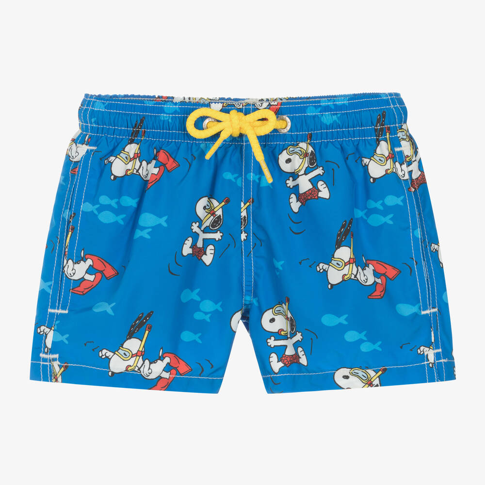 Blue swim shorts for boys by MC2 Saint Barth. In collaboration with Peanuts, they are patterned in a fun print of Snoopy scuba diving. Using recycled material, they are made in silky smooth fabric with a soft mesh lining. The waistband is elasticated for comfort and has yellow drawstring ties for an ideal fit. There are useful side seam pockets, with an additional flap pocket on the back.