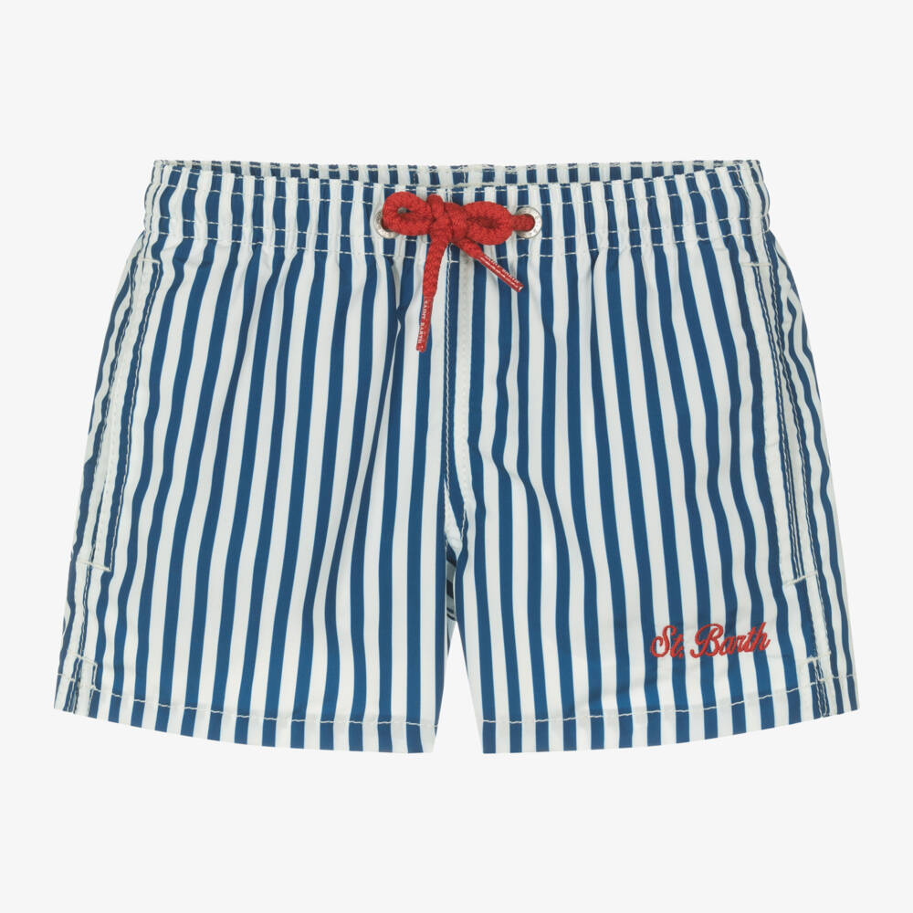 Signature swim shorts for boys by Italian label MC2 Saint Barth, striped in navy blue and white. Accented with red, they have branded drawstrings on the waist, a logo label on the back, and script embroidery above the front hem. These comfortable swim shorts are made from silky, recycled material, lined with soft mesh, and designed with an elasticated waist for ease of dressing. They have two pockets on the front and a velcro-closing pocket on the back, great for his little essentials. A convenient ID strap is included.
