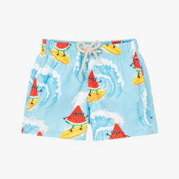These light blue swim shorts for boys by MC2 Saint Barth feature a fun and vibrant surfing watermelon print. Made from lightweight, recycled fabric, they have an elasticated waistband with a drawstring for a secure fit and a mesh lining for comfort. They pack away into the back pocket for convenience.