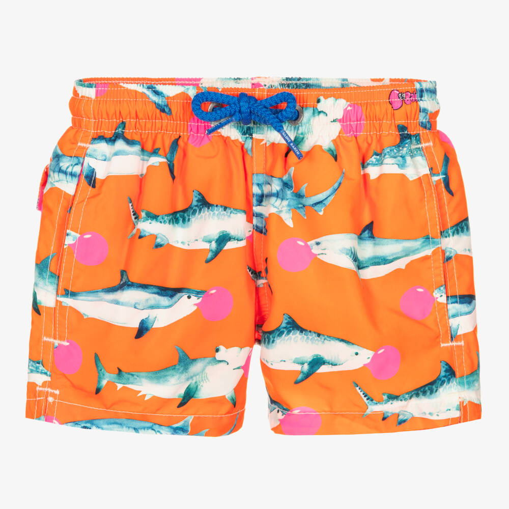 Bright orange swim shorts for boys from MC2 Saint Barth, made with recycled materials. Comfortable in silky and lightweight fabric, they are patterned with fun Big Babol bubble gum shark prints. Gentle on little tummies, the waist is elasticated and adjustable with blue branded drawstrings. These vibrant shorts are designed with three handy pockets and a soft and breathable mesh lining. On the back are branded silver eyelets and the label's logo patch for designer recognition. Convenient for travelling, the shorts pack away into the back pocket, which has a magnetic closure.
