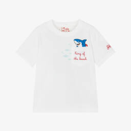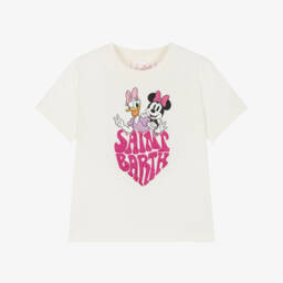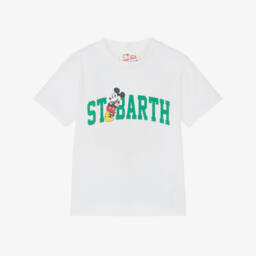 Boys white cotton T-shirt by MC2 Saint Barth, featuring Disney's much-loved characters. A classic addition to the casual wardrobe staple, the front has a colourful print of Mickey Mouse, Donald Duck, Goofy and Pluto alongside an embroidered red logo branding on the sleeve.