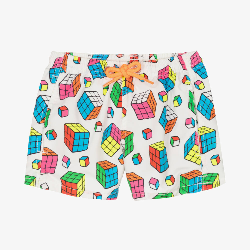 White swim shorts for boys from Italian swimwear designer MC2 Saint Barth, made with recycled materials. Soft and lightweight, these shorts are designed with a fun graphic Rubik's Cube print. They have an adjustable drawstring waistband and a breathable mesh lining for comfort. A logo badge, side seam pockets, and a velcro back pocket complete the look.