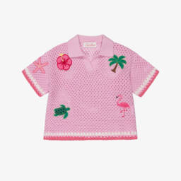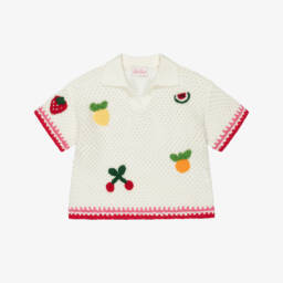 Lovely for sunny beach days, this ivory top by MC2 Saint Barth features playful knitted fruit patches on the front. Made in a soft and airy crochet knit, the short-sleeved design has a classic collar and a V-shaped neckline, with vibrant red and pink trims.