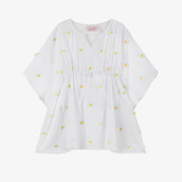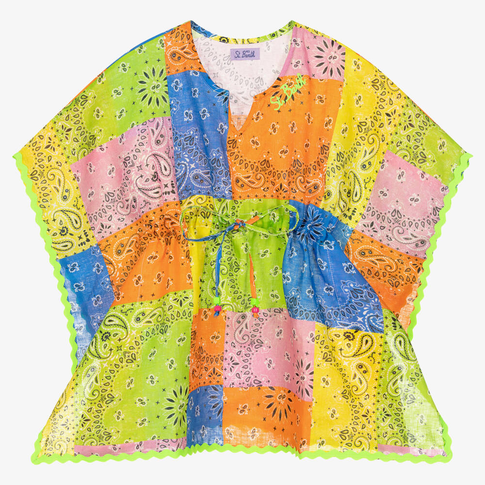 Fun and vibrant kaftan for girls by MC2 Saint Barth, made in luxuriously soft and lightweight linen. The multicolour bandana patchwork is patterned in a paisley print with a neon green ric rac trim and logo embroidery by the neckline. A drawstring with colourful beads on the waist gives this stylish beachwear a customisable fit and a feminine silhouette.
