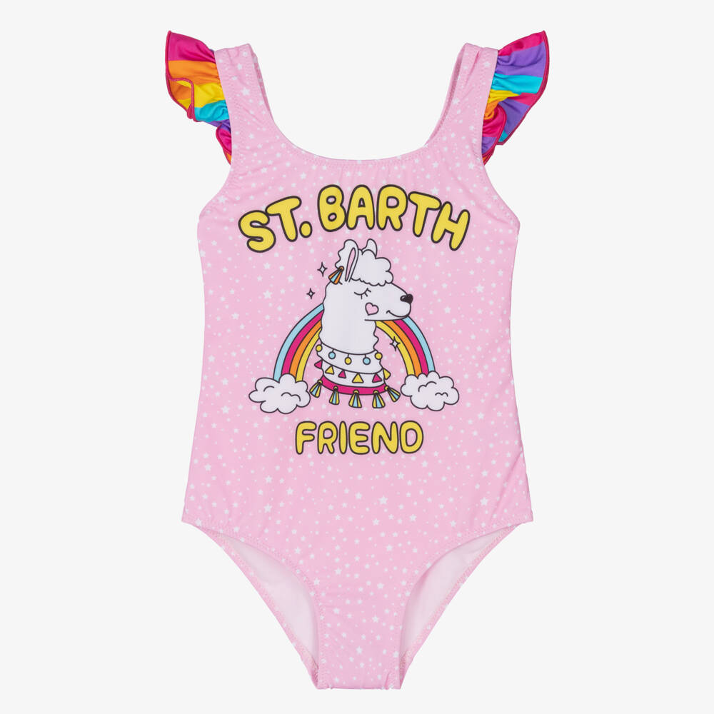 A sweet pink swimsuit for girls by luxury brand MC2 Saint Barth, made in a soft and stretchy fabric. It is patterned in stars, with a llama and a yellow 'St. Barth Friend' slogan is printed on the front. The straps have ruffled rainbow trims, and there is a logo badge on the back. It has a soft and breathable lining for a comfortable finish.